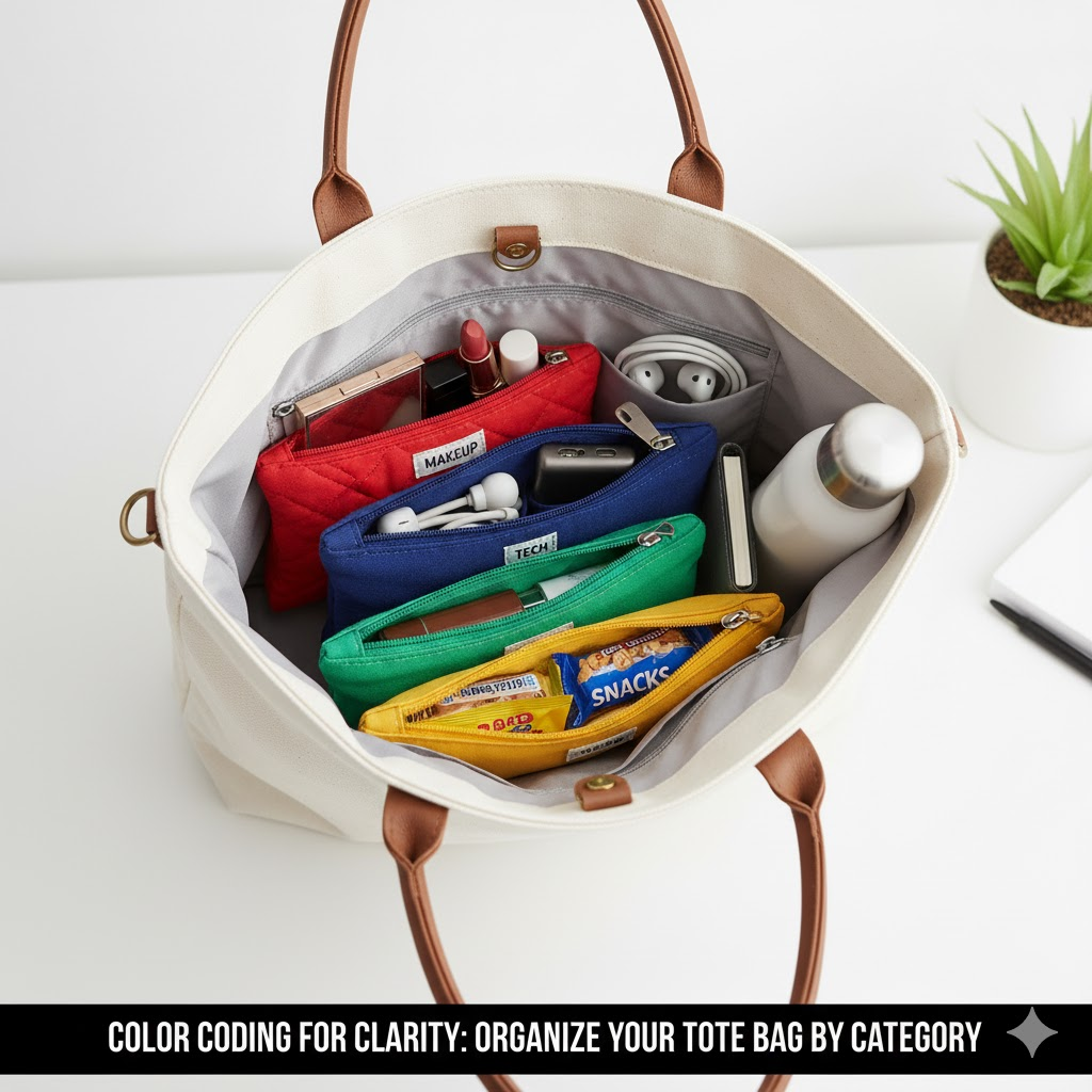 These are game-changers. Think of them as mini tote bags inside your tote. Have one pouch for makeup. Another for electronics. Another for pens or stationery. Suddenly your tote is not a black hole. It is a set of little organized zones.