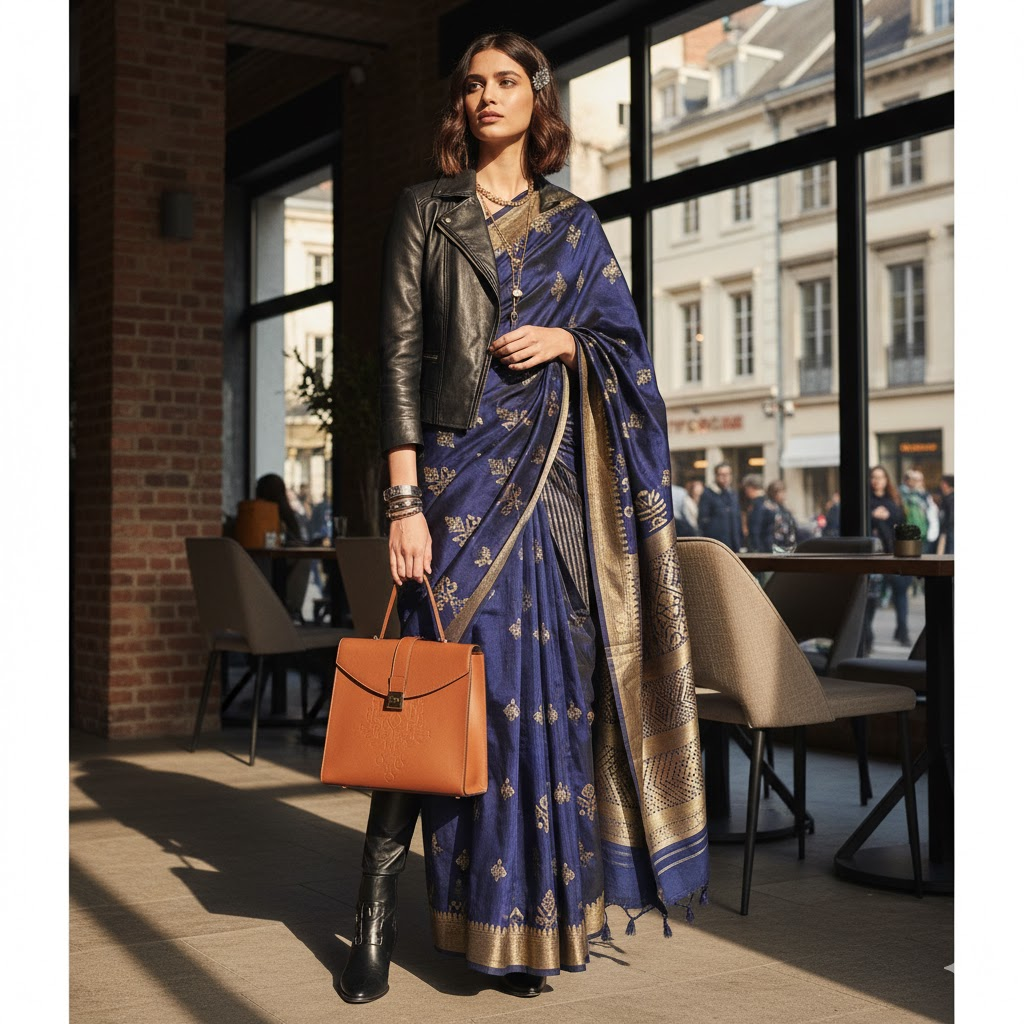 - Saree pallu crease from weight. Even it now. This is an ethnic tote styling fix. Balance sides.