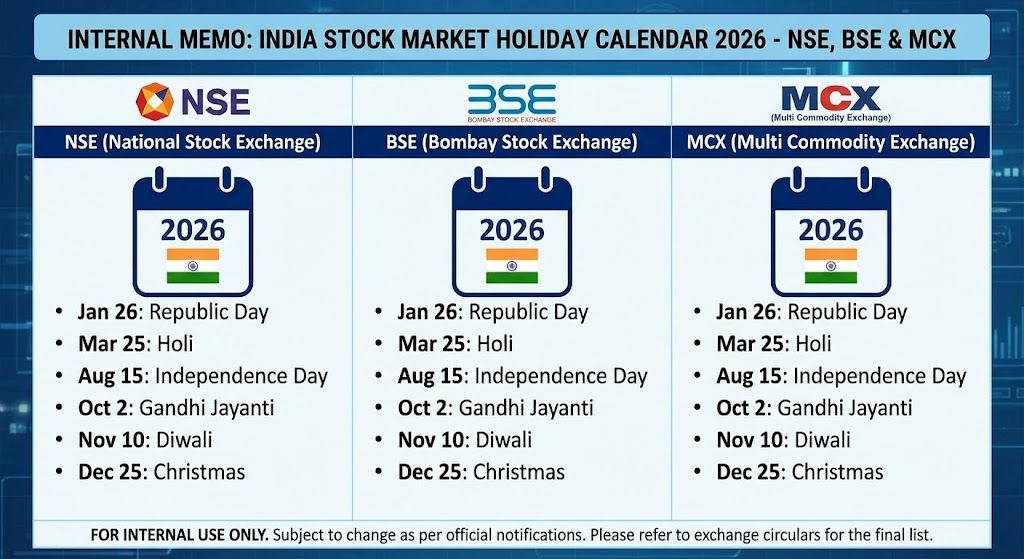 New Delhi, December 30, 2025 — Indian investors and traders have received early clarity on the 2026 stock market holiday calendar, with the National Stock Exchange (NSE), Bombay Stock Exchange (BSE) and Multi Commodity Exchange (MCX) announcing their official holiday schedules. These dates are important for planning trading strategies, settlement cycles, portfolio reviews and fund movements throughout the year.